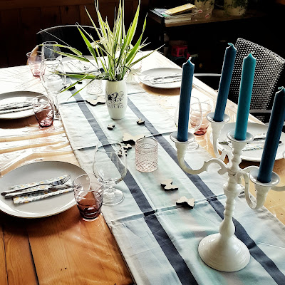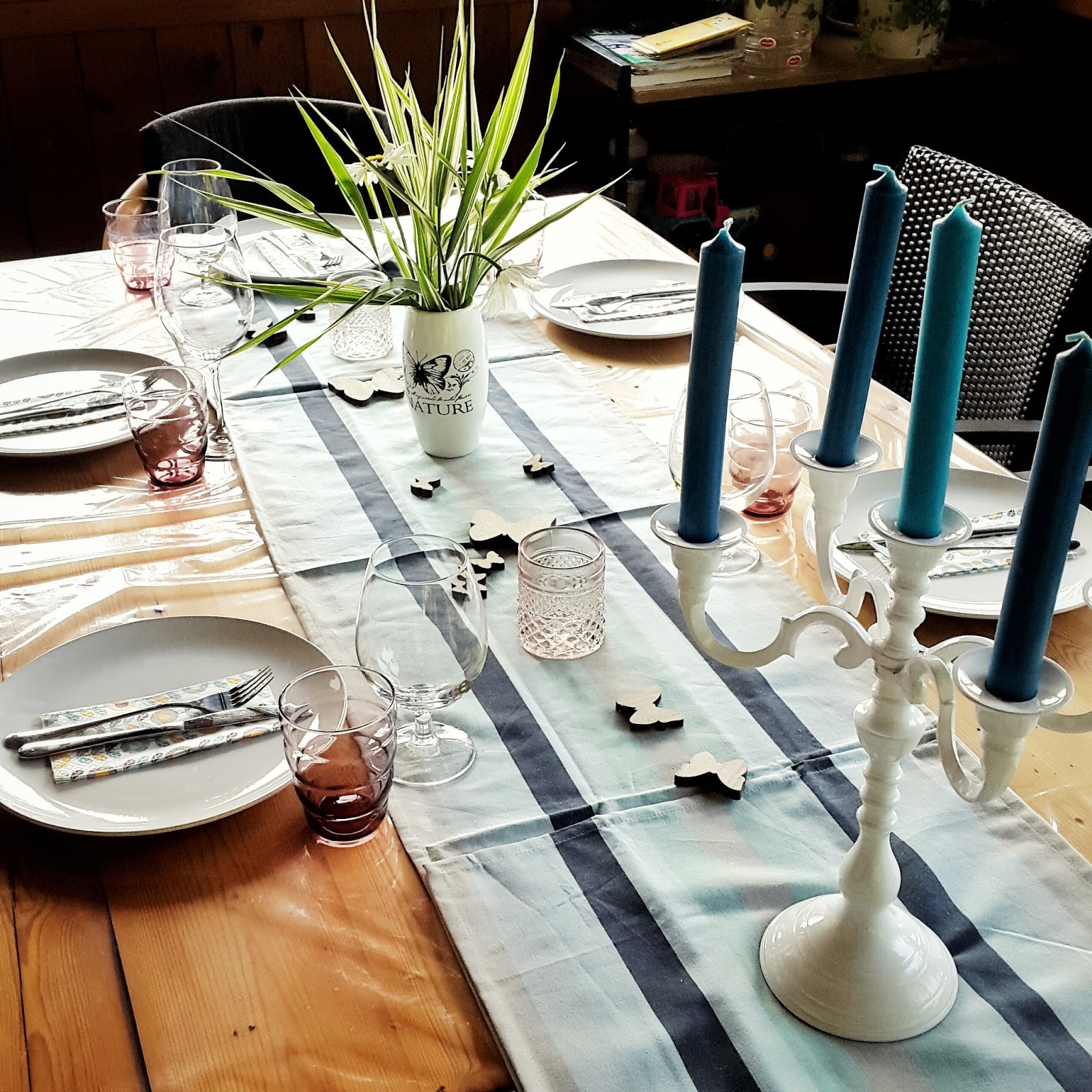 Meine Deko-Sachen kaufe ich meistens entweder bei DEPOT oder bei Nanunana. Für meine Sommertischdekoration 2015 habe ich den Tischläufer, die Teelichtgläser und die Streudeko bei ersteren gekauft. Mit dem Tischläufer bin ich besonders happy. Das Streifenmuster in den unterschiedlichen Blautönen nimmt dem Blau die maskuline Erscheinung. Es strahlt zwar noch immer diese unterschwellige Kühle aus, aber in einer Art und Weise, die in einer gewissen Leichtigkeit rüber kommt. Für mich muss Dekoration zum Bleiben und Verweilen einladen, vor allem wenn es sich um Tischdekoration handelt. Mit der Farbe Blau habe ich da oft dann meine Schwierigkeiten, denn sie übt auf mich Unnahbarkeit aus. Mit dem gemusterten Tischläufer wird dieser Eindruck bei mir aber wesentlich geschwächt.