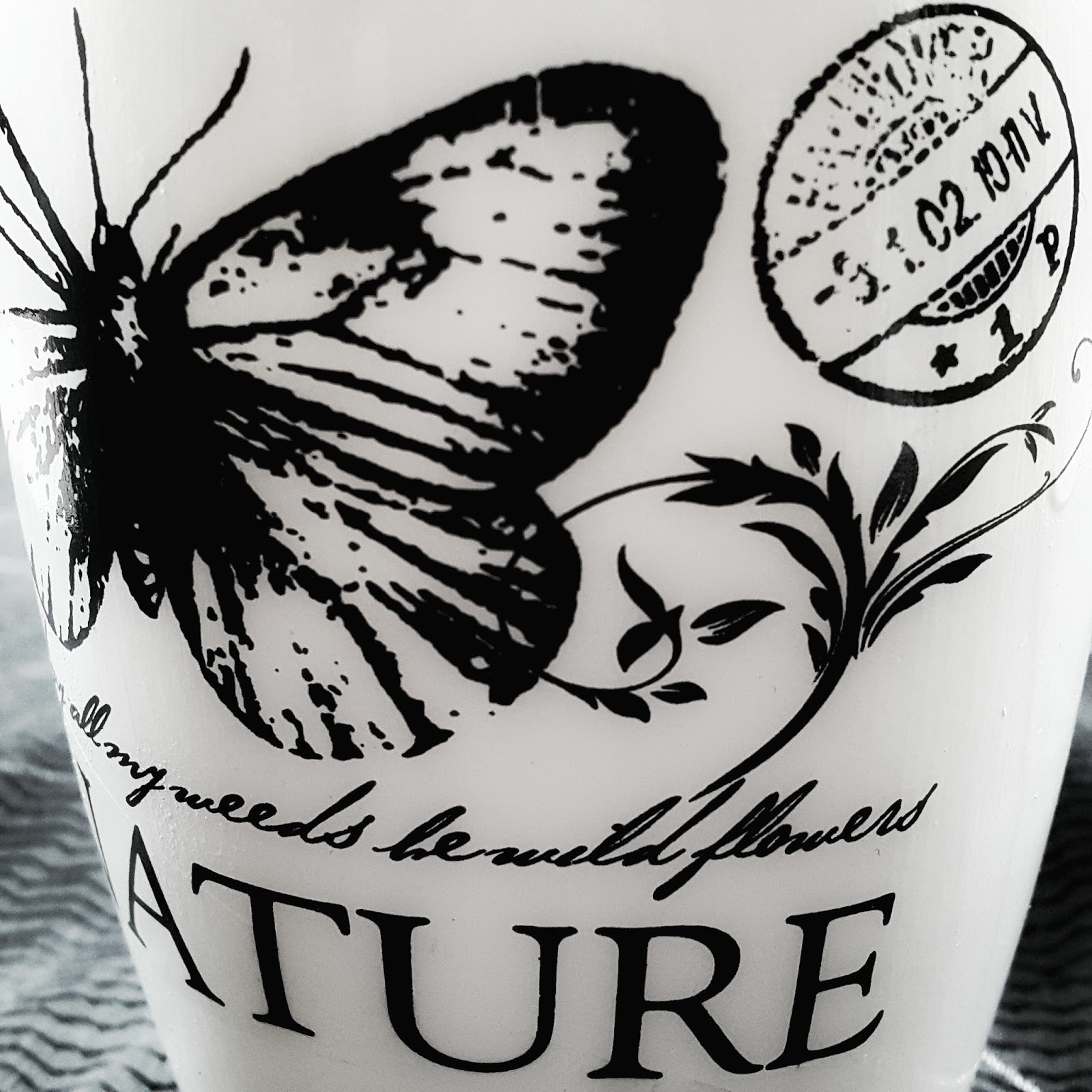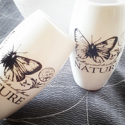Dem feierlichen Anlass zu Grunde, sind Blumen fast unumgänglich. Mit den zwei Vasen hatte ich da wirklich Glück. Der Print darauf passt sich perfekt in das Gesamtbild des Tisches. Das neutrale Weiß der Vasen konkurriert nicht mit den Kristall-Teelichtgläsern und mit dem Print harmonieren sie sehr gut mi t den hölzernen Schmetterlingen. Blumen aus dem eigenen Garten geben nicht nur eine persönliche sondern auch eine farbenfrohe Note. Wenn möglich, baue ich immer Blumen in meine Tischdekorationen ein.