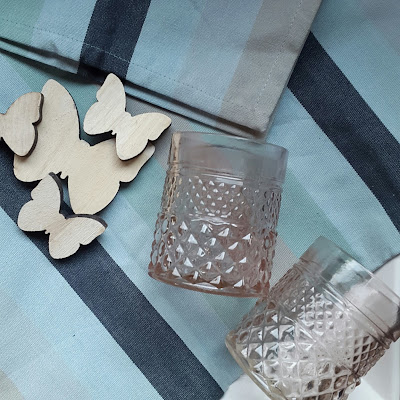 Kerzen gehören auf jeden dekorierten Tisch. Ohne Kerzen fehlt meiner Meinung nach das Persönliche. Mit Kerzen kommt Licht, Wärme und Geborgenheit an den Tisch. Und im Sommer erfüllen sie zusätzlich die Aufgabe lästige Insekten von uns fernzuhalten. Zitrus- oder Lavendeldüfte helfen Stechmücken zu verscheuchen. Die Teelichtgläser in Kristalloptik geben der Tischdekoration einen Vintage Touch und stehen im Gegensatz zum geradlinigen Muster des Tischläufers. Ich mag Stilbruch. Die Menschen, die am Tisch sitzen, sind teilweise so verschieden, warum soll nicht auch die Umgebung dies wiederspiegeln? Mit kleinen Details kann schon großes bewirkt werden, ich muss es ja nicht übertreiben. Mit den Teelichtgläsern setzte ich einen Kontrast, der aber doch eher im Hintergrund bleibt. Mitunter ist dafür auch die leichte, kaum erkennbarer Rose-Färbung der Teelichtgläser verantwortlich.