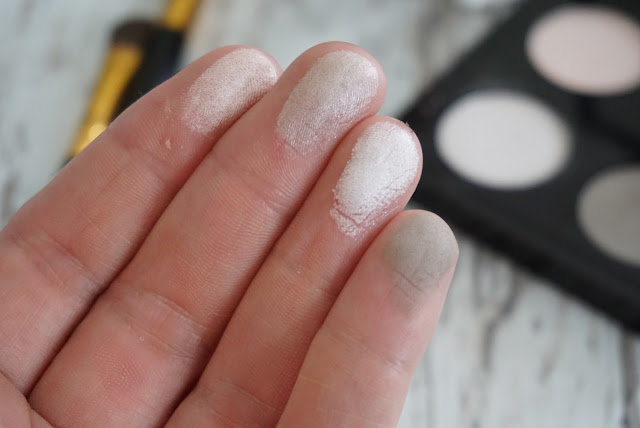 Die beiden Highlighter der Palette haben unterschiedliche Intensitäten. Während Glow (linksin der Palette) einen schönen „Erwachsenen-Glow“ zaubert, ist Dazzle (rechts in der Palette) ein richtiger „Bums-Highlighter“ mit richtig viel Glitzer. Meistens verwende ich Glow. Der andere ist mir dann doch etwas too much für tagsüber. Für ein tolles Party Makeup ist er sicher die richtige Wahl.