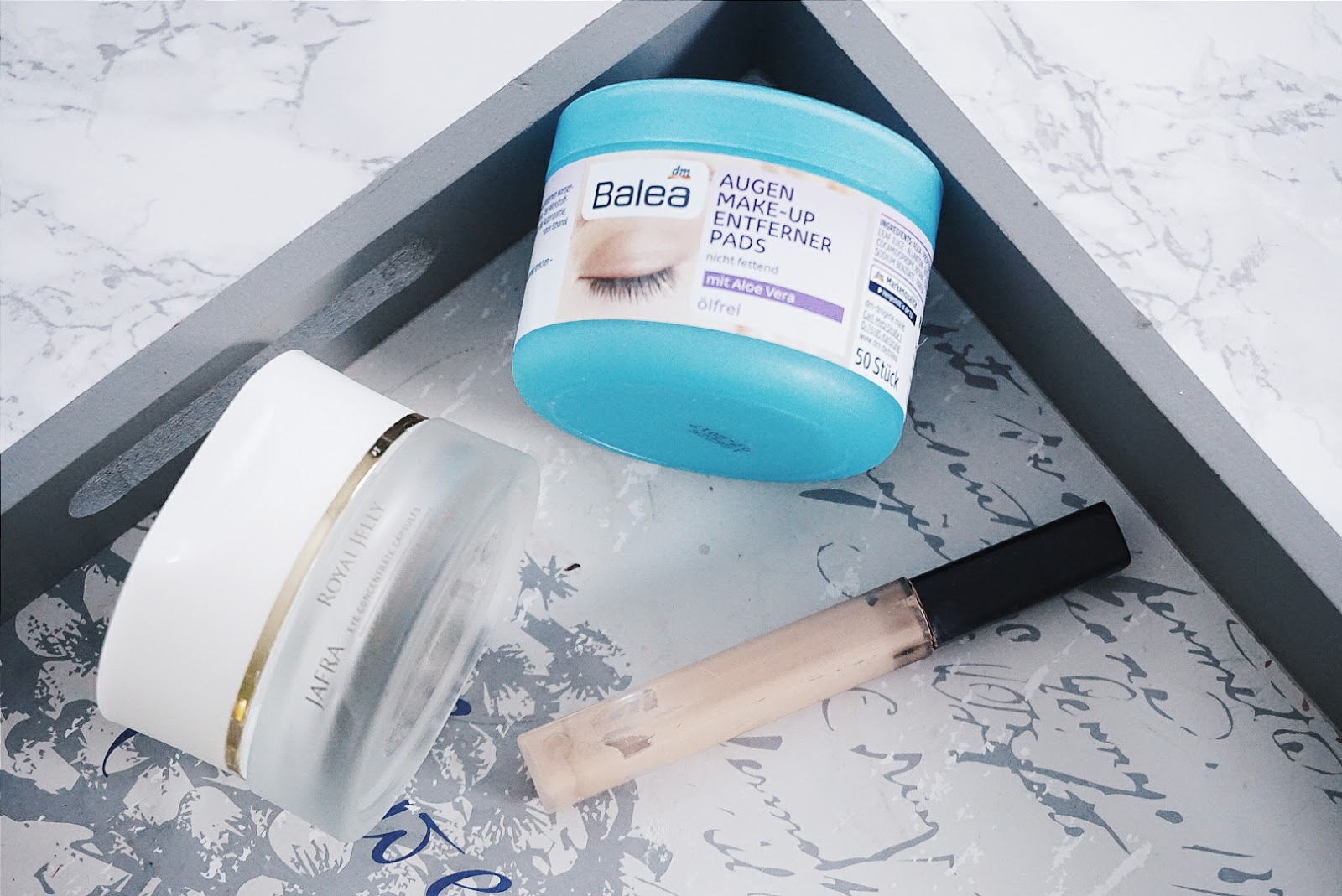 Ich sortiere ja nicht oft Produkte aus, aber bei den Balea Augen Make-Up Entferner Pads konnte ich einfach nicht anders – für mich der schlechteste AMU Entferner aller Zeiten. Die Pads haben meine Augen total gereizt und die Reinigungswirkung ging gegen Null. Dafür sind die zwei anderen Augenprodukte wirklich zu empfehlen. Die Jafra Royal JellyAugenpflegekonzentrat Kapseln verwende ich sehr gerne, wenn ich mit geschwollenen Augen konfrontiert bin oder als Intensiv-Pflegekur zwei mal im Jahr. Die Kapseln wirken beruhigend, ausgleichend und glätten die Haut um die Augen. Das, was sie nicht wegzaubern, kaschiere ich dann gerne mit dem Maybelline Fit me Concealer. Er hat eine cremige Konsistenz, deckt prima und ist sehr ergiebig. Ich habe hier die Nuance 10. Ich dachte es sei die hellste. Nachgekauft habe ich aber dann doch die Nuance 15, denn diese ist noch etwas heller und hat einen rosa Unterton. Der passt besser zu mir, als der gelbliche von der Nuance 10.