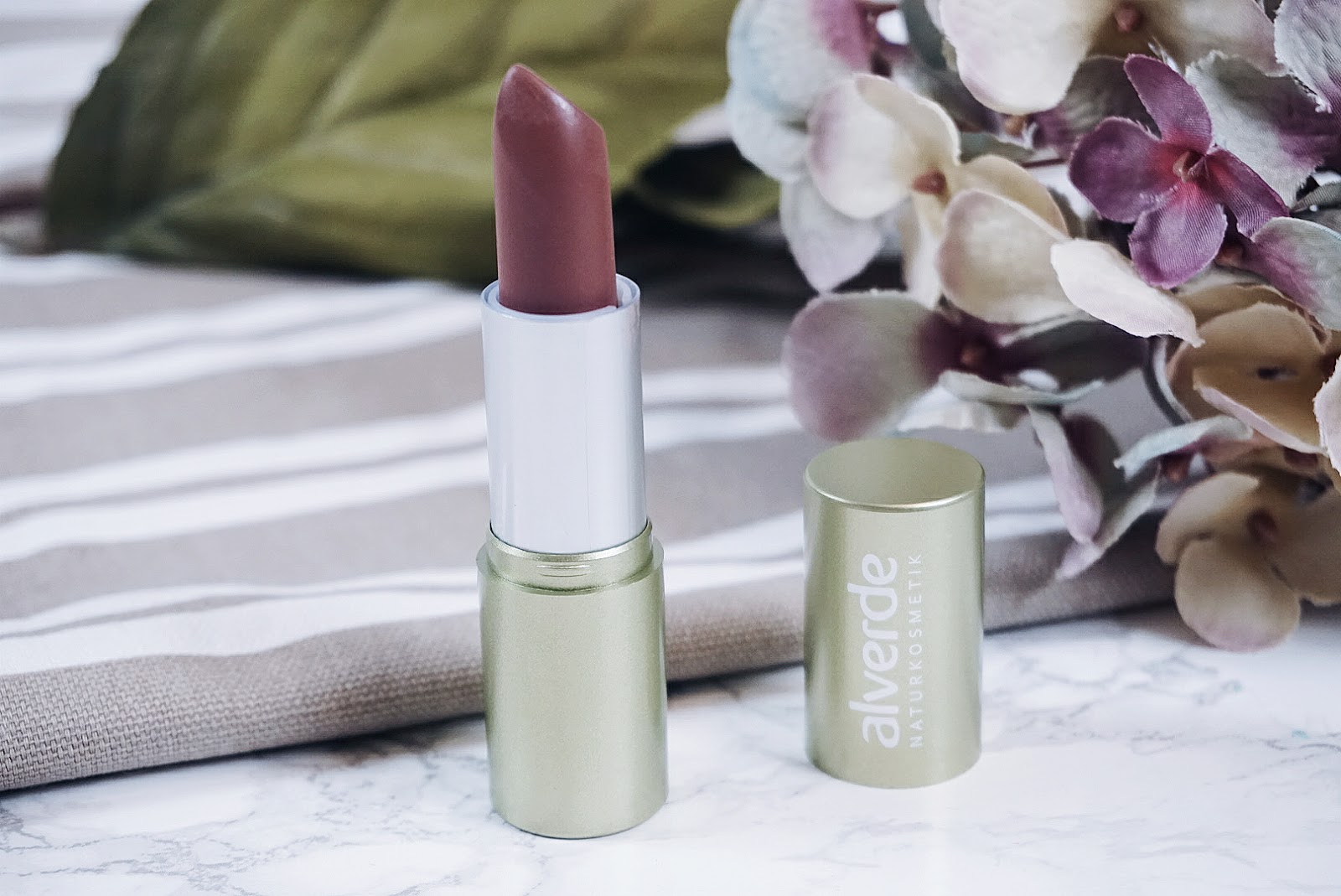 Was darf bei einem Herbst-Look nicht fehlen? Der Lippenstift natürlich. Und der alverde Lippenstift 30 Chai Latte ist mein zweiter Favorit aus dem neuen Sortiment. Zum einen ist die Farbe einfach der Hammer. Das dezente Rot-Braun sieht wunderschön auf den Lippen aus. Für mich, die ja warme Farbtöne sehr mag, eine perfekte Lippenstiftnuance. Zum anderen sehen meine Lippen mit dem cremigen Finish sehr gepflegt aus und fühlen sich auch so an. Dafür sorgt ein vielfältiger Cocktail aus Ölen und Vitaminen. Auch mit der Haltbarkeit bin ich vollauf zufrieden. Da kann der alverde Lippenstift 30 Chai Latte locker mit seinen Kollegen aus der konventionellen Ecke mithalten. Wenn das Design der Verpackung jetzt noch etwas edler aussehen würde, ich hätte mir sofort noch zwei oder drei gekauft. Der Lippenstift in Chai Latte ist mein Favorit für einen natürlichen Herbst-Look, denn diese Farbe passt einfach super zu dem bunten Treiben der Natur in dieser Jahreszeit.