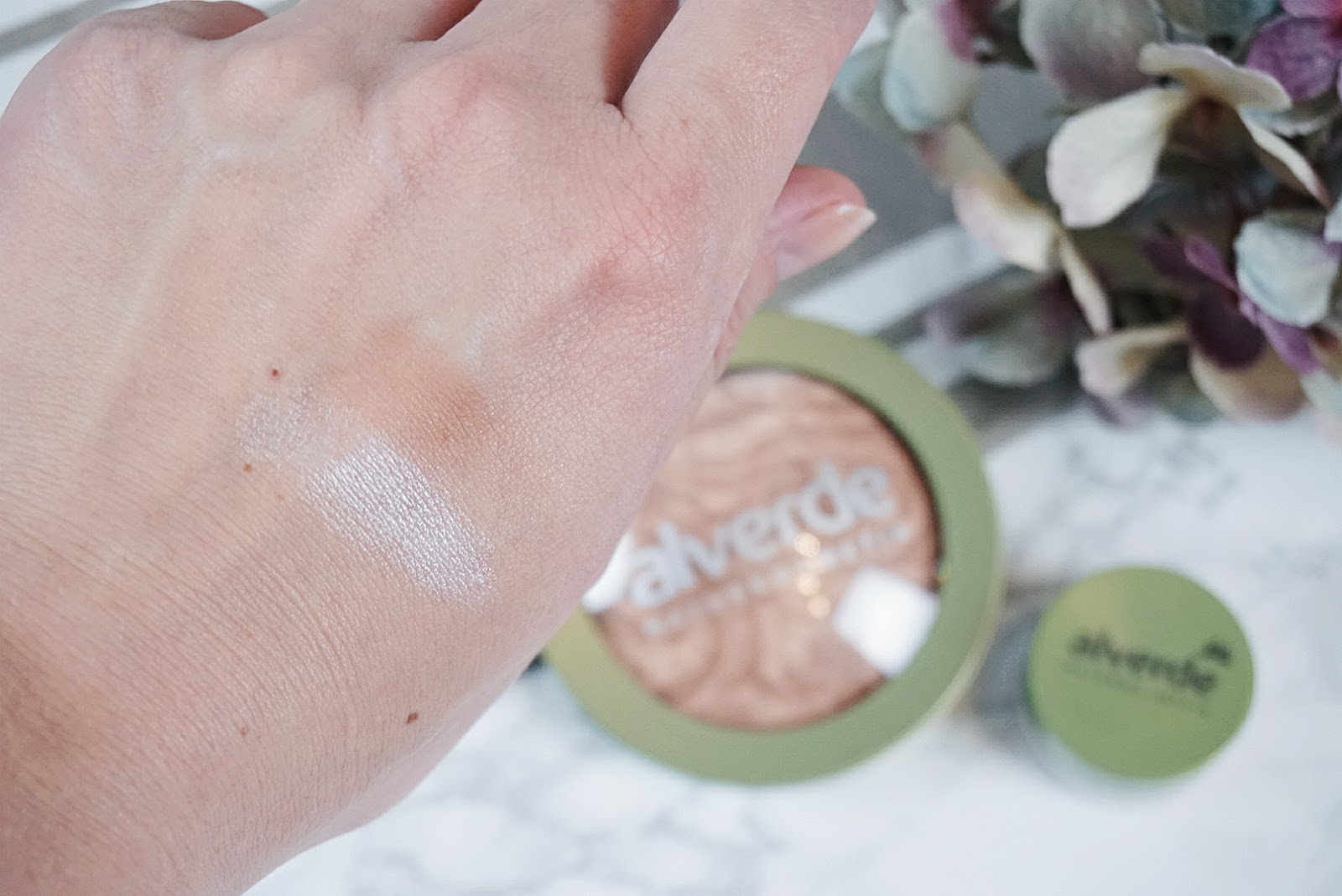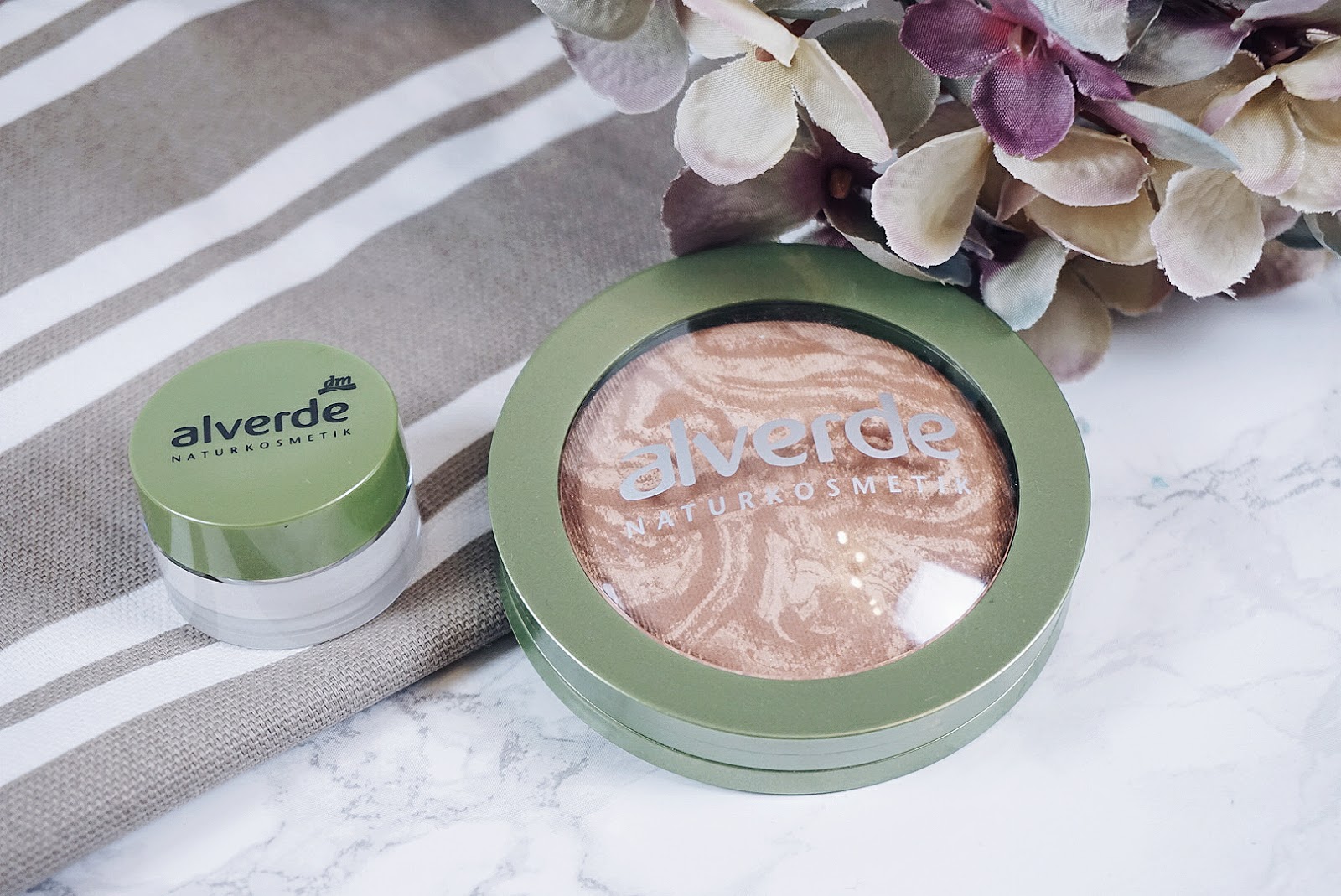 Als erstes habe ich den alverde Duo Bronzer und den alverde Highlighter für meinen natürlichen Herbst-Look verwendet. Bronzer sind ja bei meiner hellen Haut immer mit Vorsicht zu genießen. Dieser hier sorgt aber mit seiner Marmorierung aus einem hellen und einem etwas dunkleren Nude-Ton für einen schönen, zart gebräunten Teint. Der alverde Duo Bronzer ist nicht matt. Er hat einen leichten Schimmer, glitzert aber nicht. Ich bin ja absolut kein Fan von glitzernden Foundations, Puder oder Bronzer, doch hier sind die schimmernden Partikel noch in einem erträglichen Maß vorhanden. Der dezente Bronzer wirkt nicht zu aufdringlich und passt sehr gut zu meinem hellen Teint – nicht nur für das gesamte Gesicht, sondern auch zum „Soft-Contouring“. Verleiht der Bronzer meinem Gesicht Tiefe, bewirkt der alverde Highlighter genau das Gegenteil, er betont und hebt Gesichtszüge hervor. Der Highlighter ist einer meiner Favoriten aus dem neuen Sortiment. Ich trage ihn jeden Tag und liebe ihn einfach. Der elfenbeinfarbige Creme-Highlighter gibt meinem Look die Frische, die ich brauche und das Strahlen, welches ich mir wünsche. Die Textur verbindet sich perfekt mit meiner Haut. Cremige Highlighter sind eigentlich nicht so sehr mein Fall. Sie sind mir einfach zu schwer, doch bei dem alverde Highlighter tritt genau das Gegenteil ein. Ich spüre ihn kaum. Die Highlights sehen einfach super aus – natürlich schön und dezent. Genau so soll es sein.