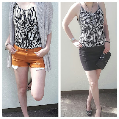 Beide Outfits werden durch das Top aufgewertet. Dem Party Look verleiht es, zu der zurückhaltenden Eleganz des Schwarz, eine gewisse, aufregende Note. Im Casual Outfit hingegen nimmt es etwas von dem Hervorstechen der Short.